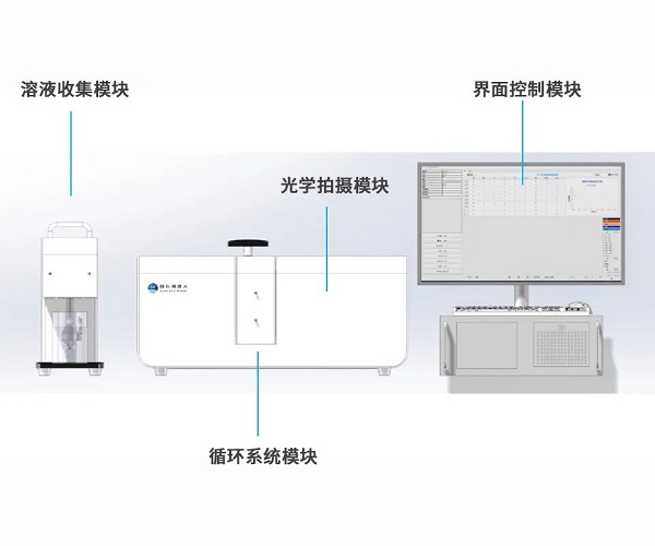 濕法粉末雜質分析儀主要包括以下部分:界面控制模塊、光學拍攝模塊、循環系統模塊和溶液收集模塊。